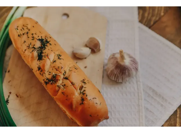 Состав: дрожжевое тесто(яйцо куриное, мука в/с, вода, масло сливочное, соль, сахар, дрожжи), масло растительное, укроп, чеснок