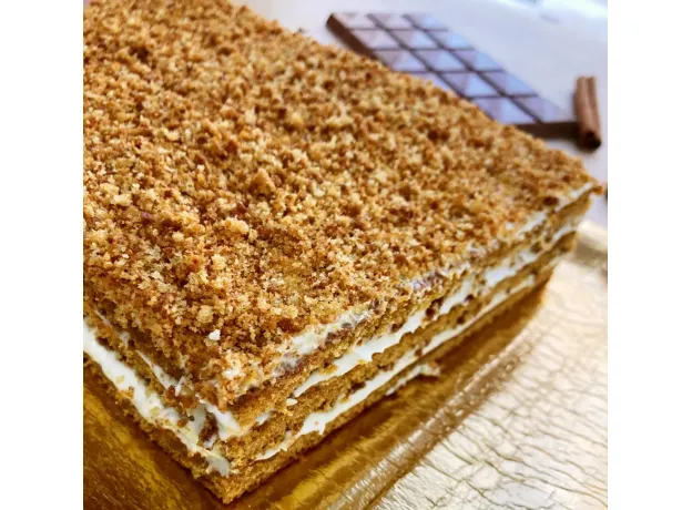 Состав: мука пшеничная в/с, яйцо куриное, мёд, сода пищевая, сахар, сметана, ванилин, уксус, сливки 36%