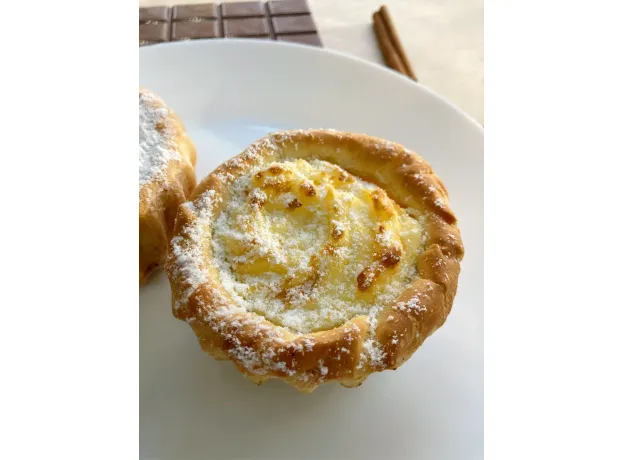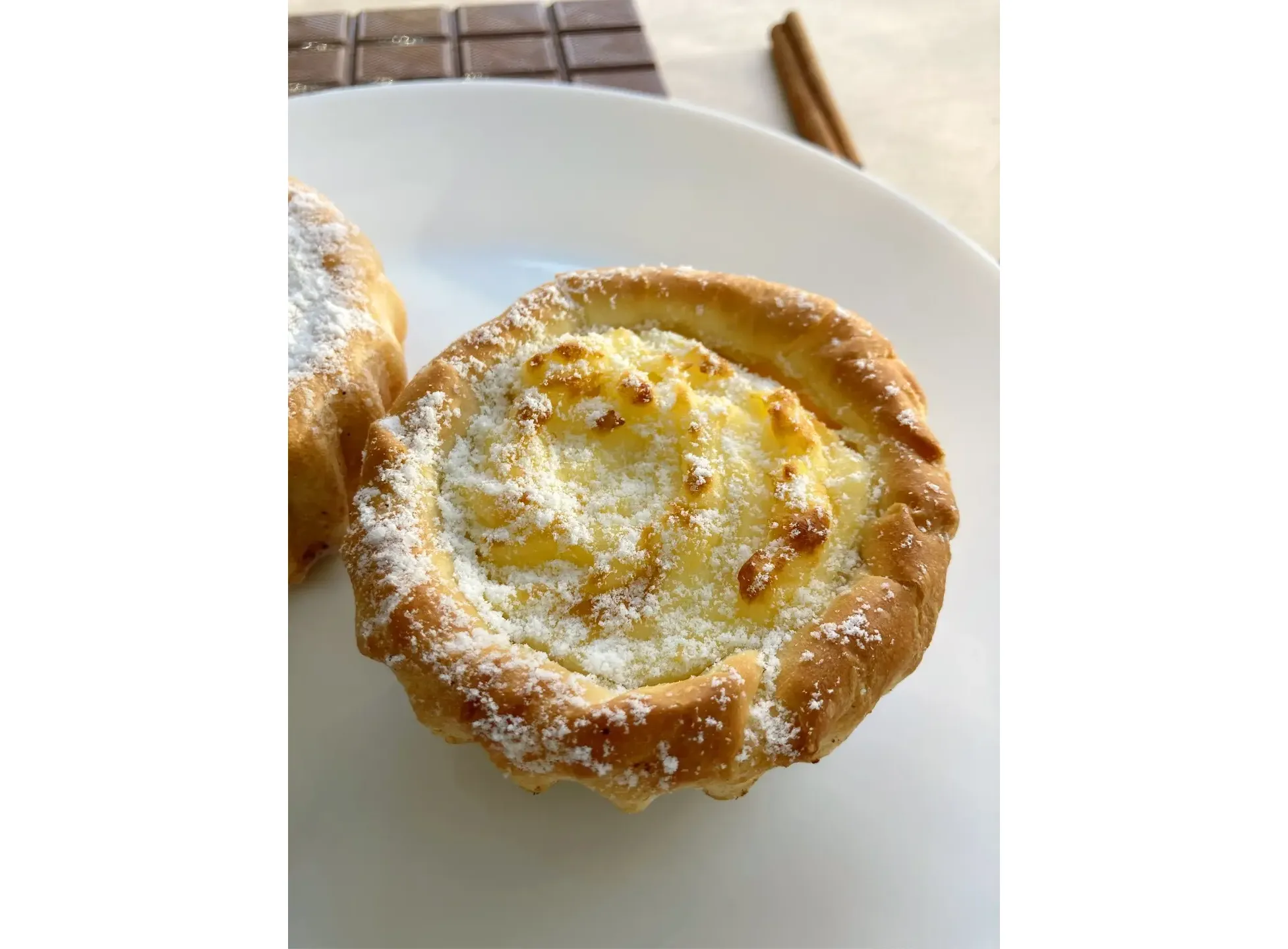 Состав: тесто дрожжевое (мука в/с, яйцо куриное, вода, сахар, соль, масло сливочное), сметана, сахар, ванилин