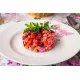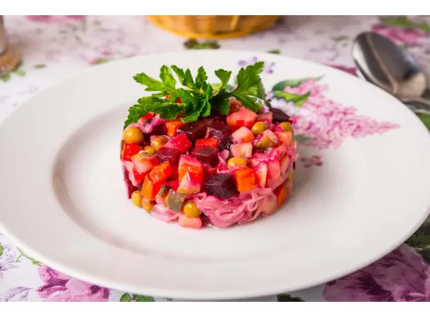 Состав: свекла, морковь, картофель, лук зеленый, лук репчатый, горошек огурец соленый, капуста квашеная, масло растительное