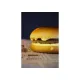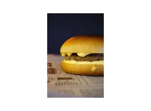 Булочка, котлета говяжья, лук, лист салата, сырный соус