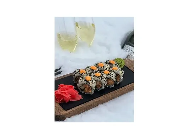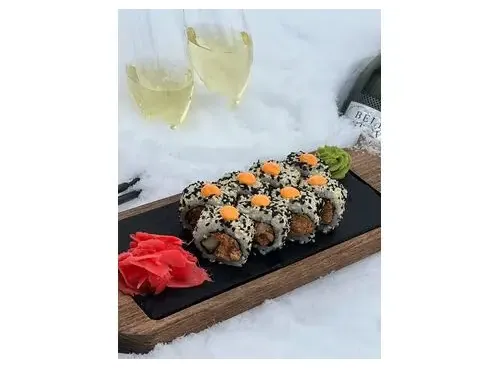 Ролл с обжаренным лососем, огурцом, острым соусом спайси, обсыпан в кунжуте. 8 шт.