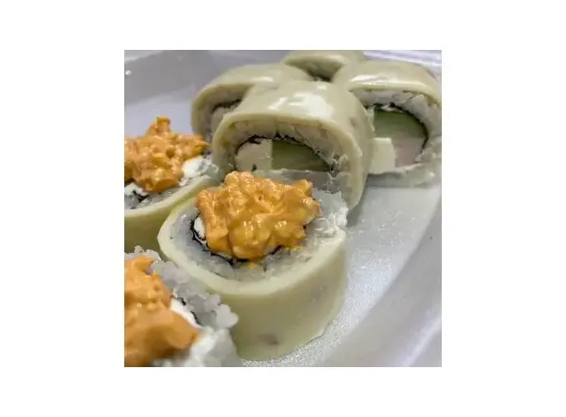 Состав:Рис НориТворожный сыр Копчённая курицаОгурецОбвернут на 3/4 в плавленом сыреНа четырех кусочка лава шапка. Порция, 8шт