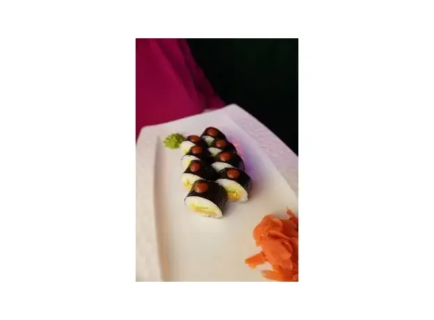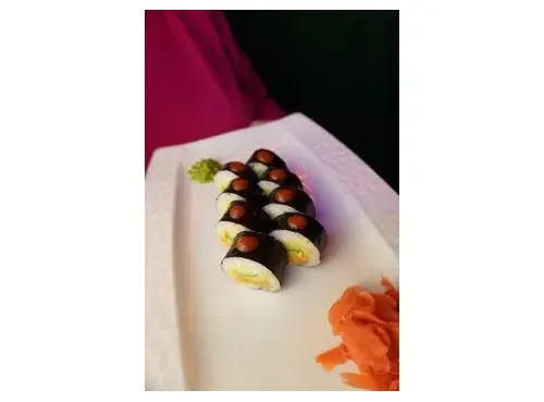 Острый ролл с лососем, огурцом, авокадо и соусом спаси, политый соусом шрирача. 8 шт.
