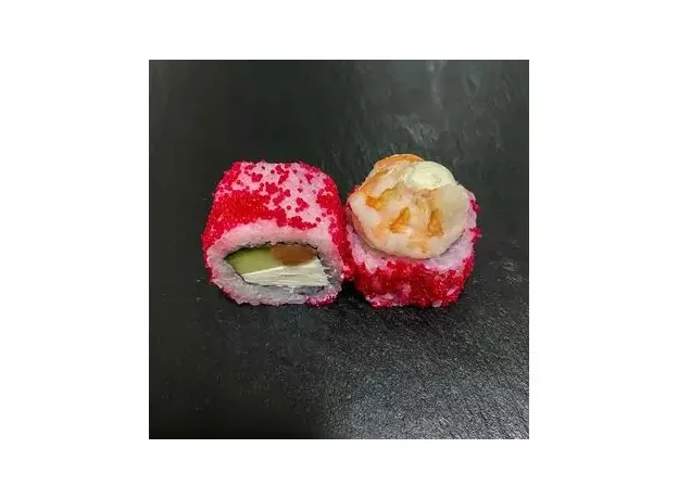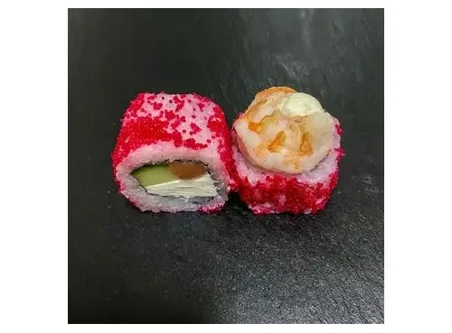 Состав:РисНориТворожный сырОгурецЛососьВ обсыпке из икры масагоПод шапкой из креветок. Порция, 8шт.