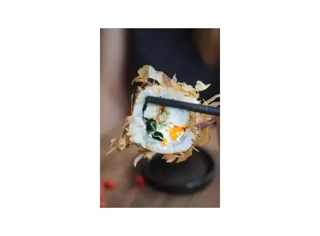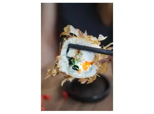 Ролл со сливочным сыром, угрём, королевской креветкой, икрой масаго и зелёным луком, в обсыпке из стружки тунца. 8 шт.