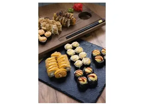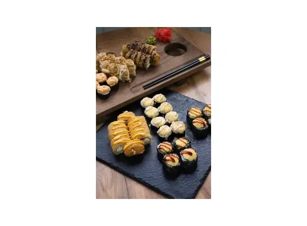 2 холодных ролла:-ролл с огурцом и острой шапкой;-филадельфия бонито (в стружке тунца);2 темпурных ролла:-темпура чикен, полит соус терияки;-ролл 4 сыра;2 запеченных ролла:-ролл с беконом, зеленым луком и огурцом, запеченный под шапкой из японского майонеза и полит ореховым соусом;-ролл с кларием угревидным, огурцом и помидором, в обсыпке из кунжута, запеченный под шапкой из японского майонеза и полит соусом унаги.Сет рассчитан на 4 персоны.48 шт, 1450 гр
