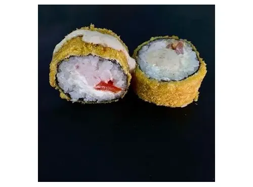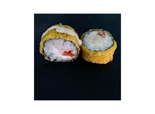 Рис, нори, копчёная курочка, творожный сыр, сладкий перец, кляр, сухари панко, обжарен во фритюре и полит ореховым соусом. 8шт.