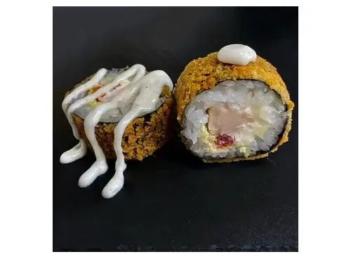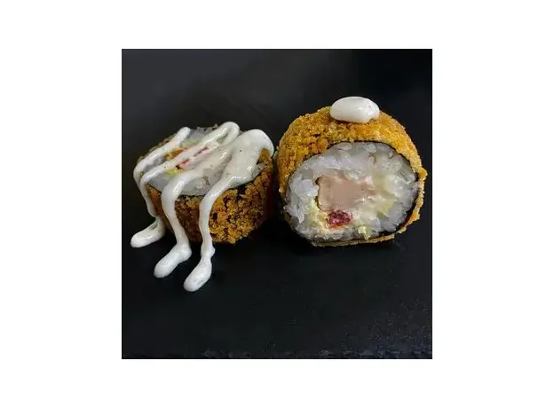 Рис, нори, творожный сыр, копченая курица, помидор, пекинская капуста, обвален в кляре и сухарях панко, жареный во фритюре и полит соусом цезарь. 8шт.