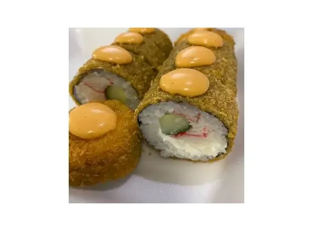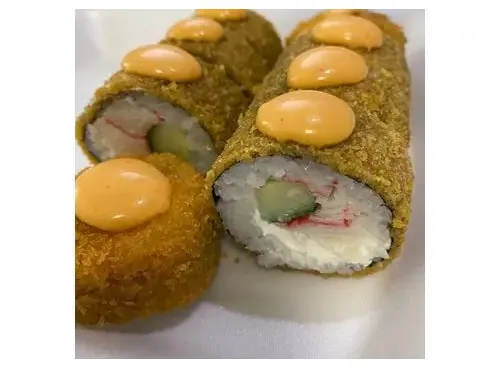 Рис, нори, творожный сыр, мясо снежного краба, огурец, обвален в кляре и сухарях панко, жареный во фритюре. 8шт.