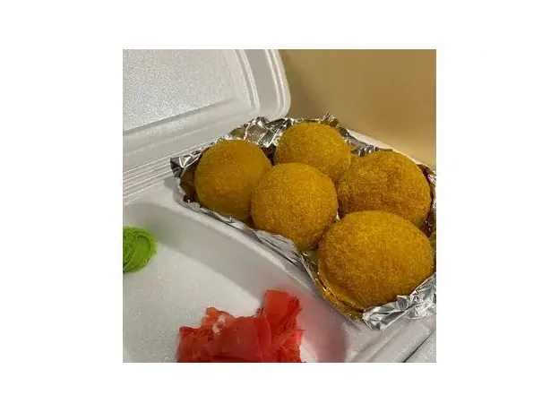 Рисовые шарики с лососем и с сливочным сыром, обваленные в кляре и сухарях панко, жареные во фритюре. 5шт.