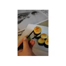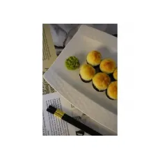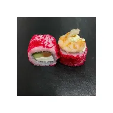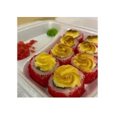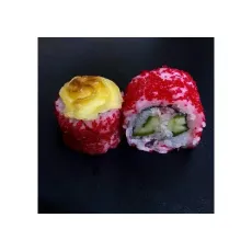 Рис, нори, огурец, мясо снежного краба, в обсыпке из икры масаго, запеченный под шапкой из японского майонеза. 8шт.