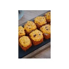 Рис, нори, творожный сыр, огурец, лосось, в обсыпке из икры масаго, под шапкой из креветок, запеченный. 8шт.