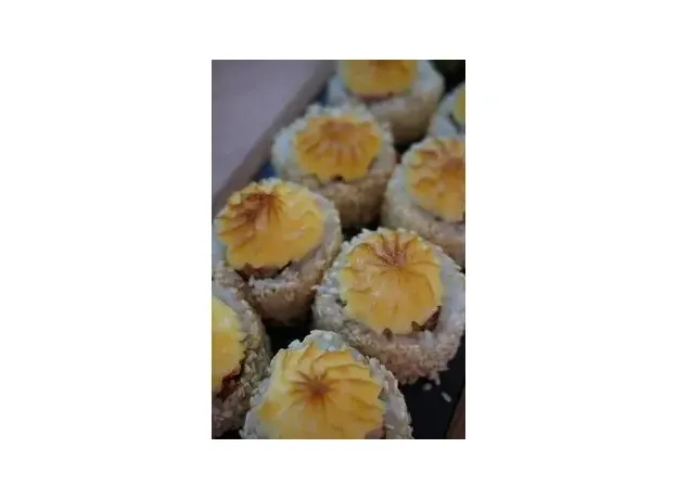 Ролл с мясом краба (сурими), лососем и огурцом, в обсыпке из кунжута, запечённый под шапкой из японского майонеза. 8 шт.