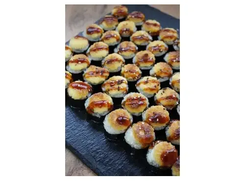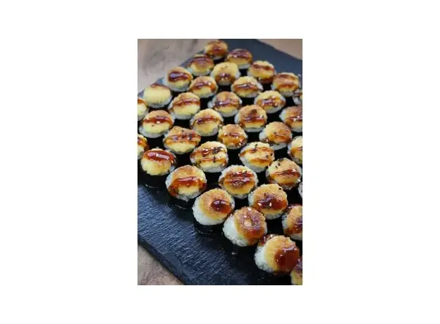 Ролл маки с огурцомРолл маки с помидором Ролл маки с куройРолл маки со сливочным сыромРолл маки с ветчинойРолл маки с мясом краба(сурими)Запечённые под шапкой из японского майонеза и политы соусом терияки. 48 шт, 1200 гр