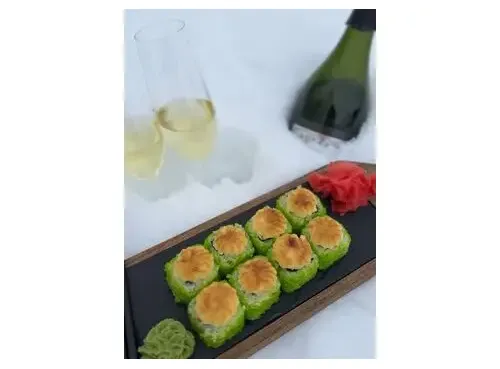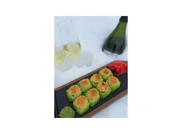 Ролл с креветкой, сливочным сыром и авокадо в икре тобико, запеченный под шапкой из японского майонеза. 8 шт.