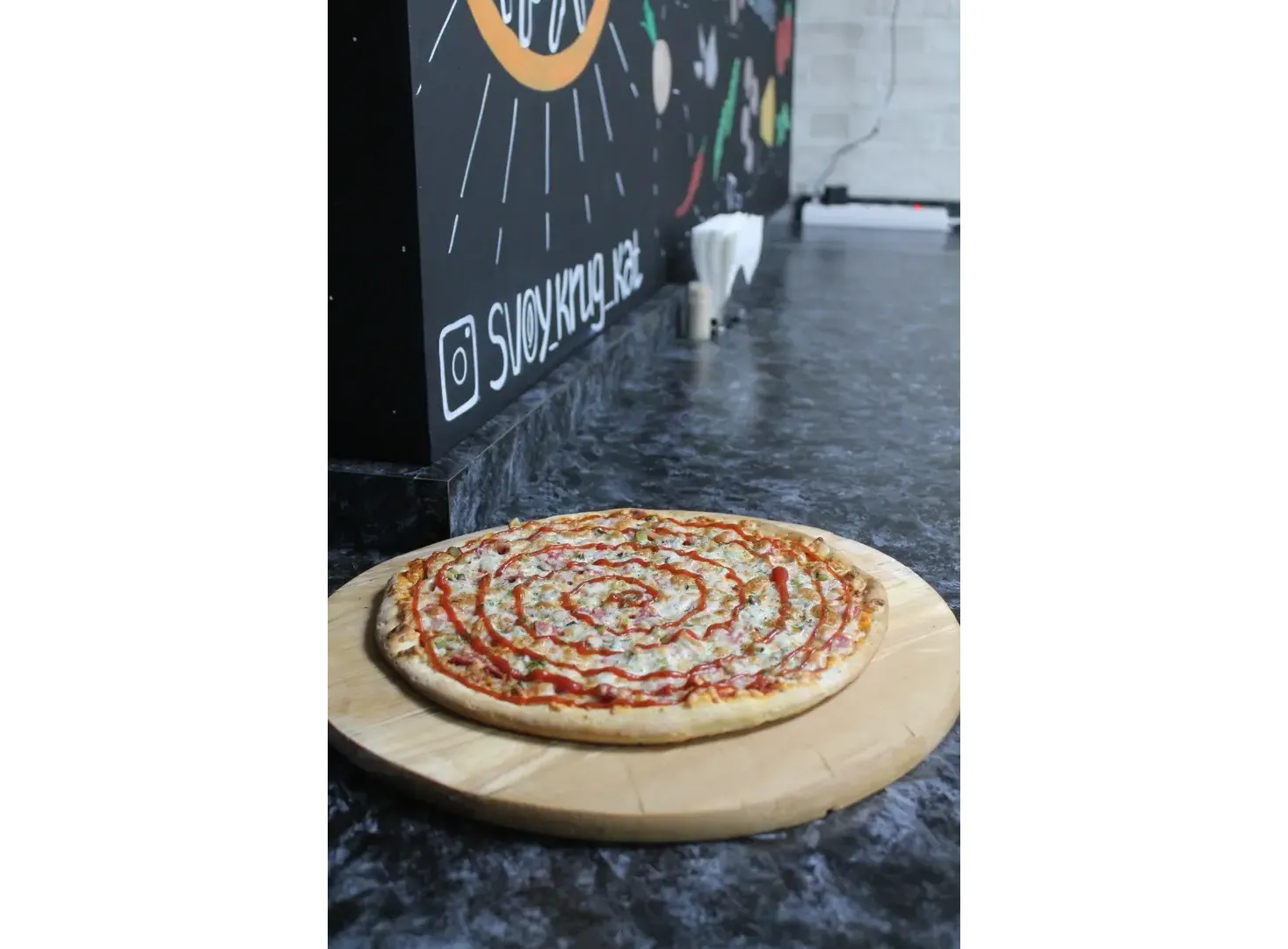 Диаметр 30смФирменный соус , п/к колбаса, ветчина, солёный огурец, сыр моцарелла, кетчуп, укроп, петрушка