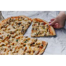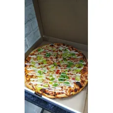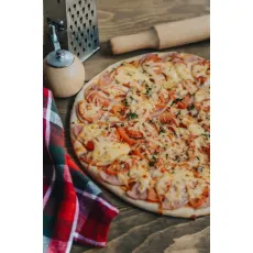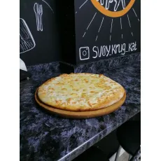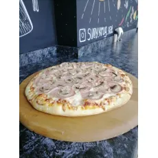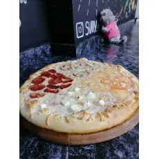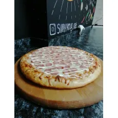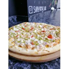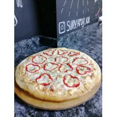 Фирменный соус, копченная курочка, сыр моцарелла, украшена пикантной колбасой пепперони и беконом, полита ореховым соусом.Очень сытная пицца ??